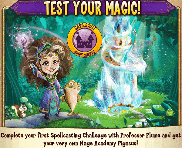 Complete your first castleville Spellcasting Challenge with Professor Plume and get your very own Mage Academy Pigasus! The Spells & Enchantments Wing of the Mage Academy can also be use repeatedly to get you great rewards like random spell parts!